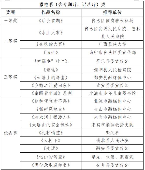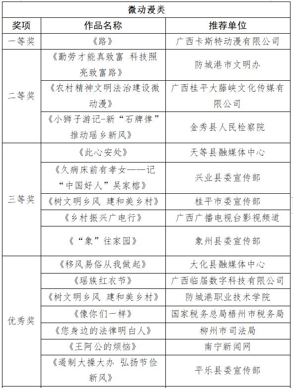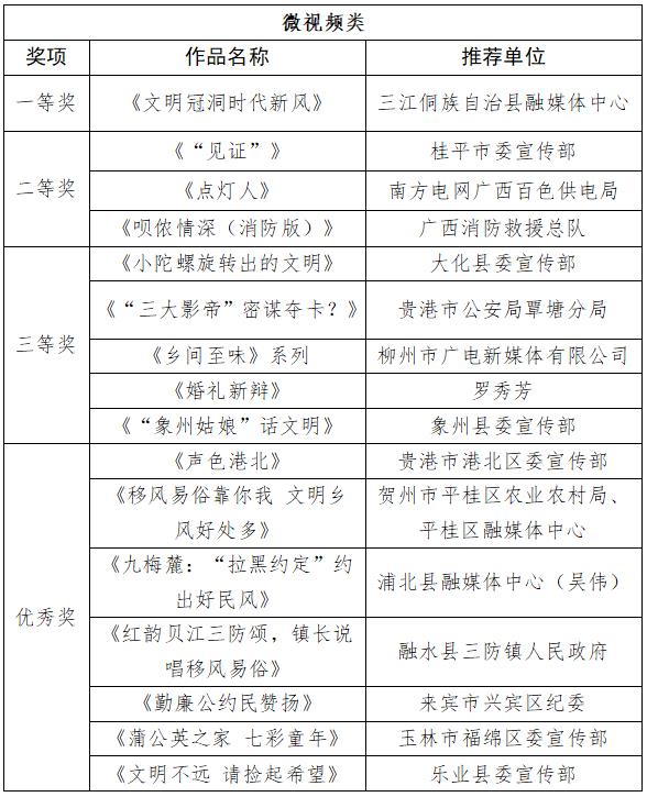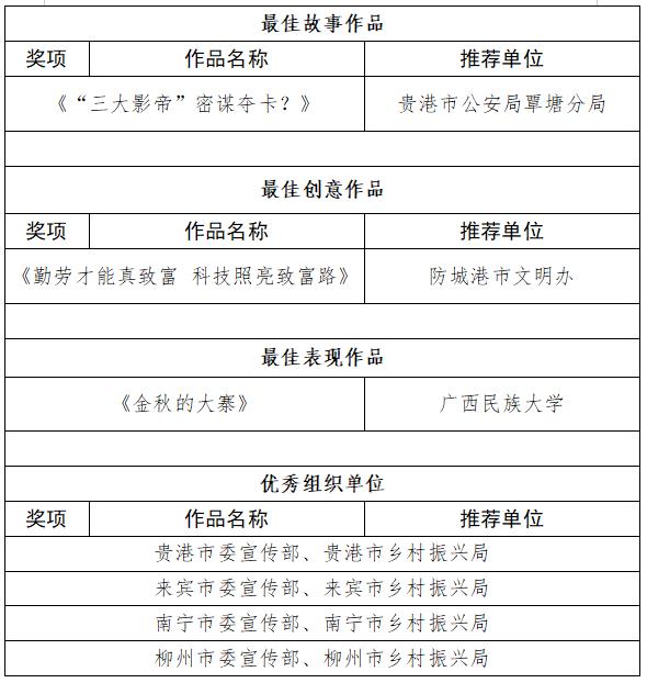 根据《自治区党委宣传部 自治区乡村振兴局 自治区广电局关于举办农村精神文明建设微视频微电影微动漫作品征集比赛的通知》要求,比赛经宣传发动、作品报送、专家评审等环节,现将拟获得一等奖、二等奖、三等奖、“最佳故事作品”“最佳创意作品”“最佳表现作品”和优秀组织奖(单位)名单予以公示,公示期5天(2023年7月26日—30日)。如对有关作品和单位的评审结果有异议,请以书面形式并署真实姓名及联系方式,于2023年7月30日前邮寄或直接送达自治区乡村振兴局。