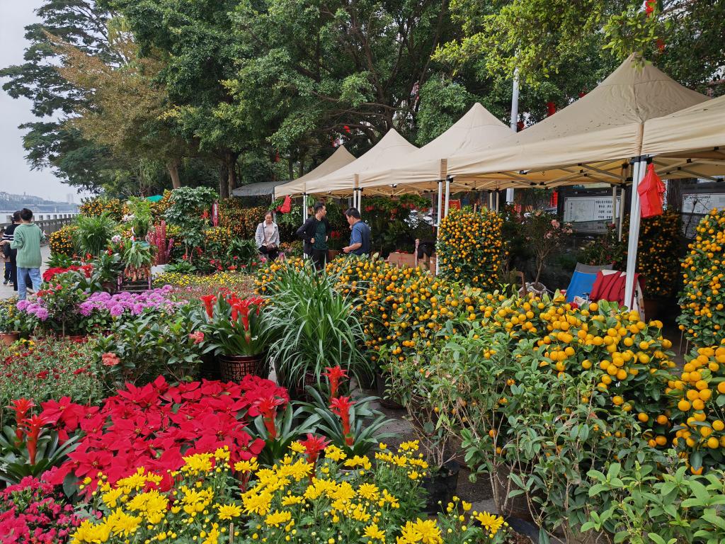 除了买对联和新年挂饰,花卉和盆栽也列入不少市民的年货清单,春节花市日渐火热。杜鹃、牡丹、菊花……在容县的一处花卉市场,多彩的鲜花和各式盆栽烘托出新春将至的喜庆氛围。在一处摊位上,容县春色农业科技有限公司负责人潘成宏正在打理摆设的盆栽,为市民介绍花卉的花期和种植技巧。在他的店铺里,各种颜色的牡丹花竞相开放,吸引不少顾客选购,现场一派热闹景象。
