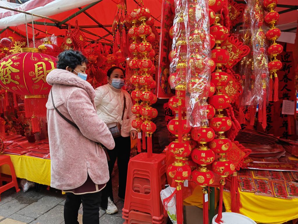 市民在挑选春联和新年挂饰。新华社记者 黄庆刚 摄