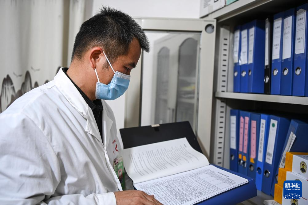 2月19日,在广西兴业县山心镇公和村卫生室,钟伟平查看村民的健康档案。