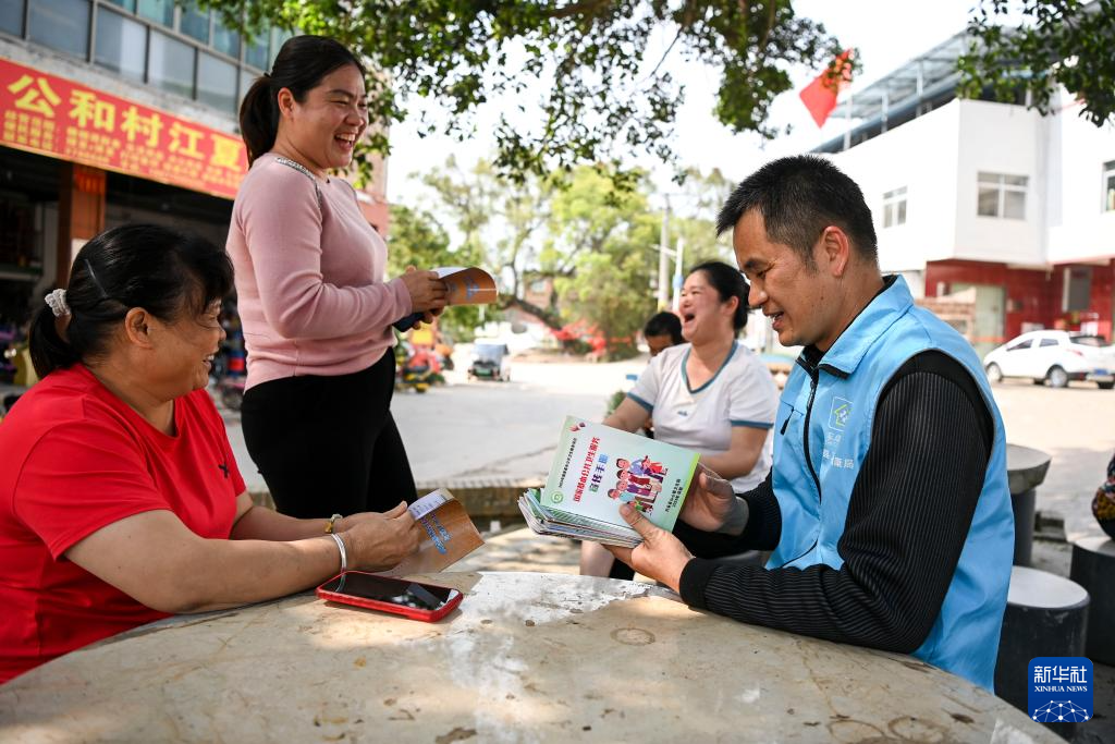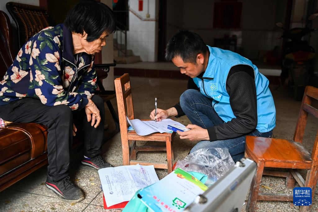 2月19日,在广西兴业县山心镇公和村,钟伟平(右一)给村民宣传国家基本公共卫生服务政策。