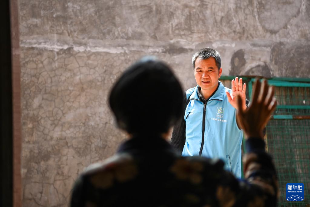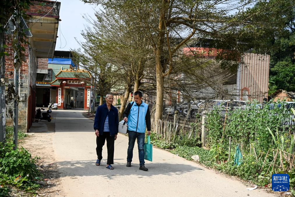 2月19日,在广西兴业县山心镇公和村,钟伟平(右)出诊结束后与村民挥手道别。