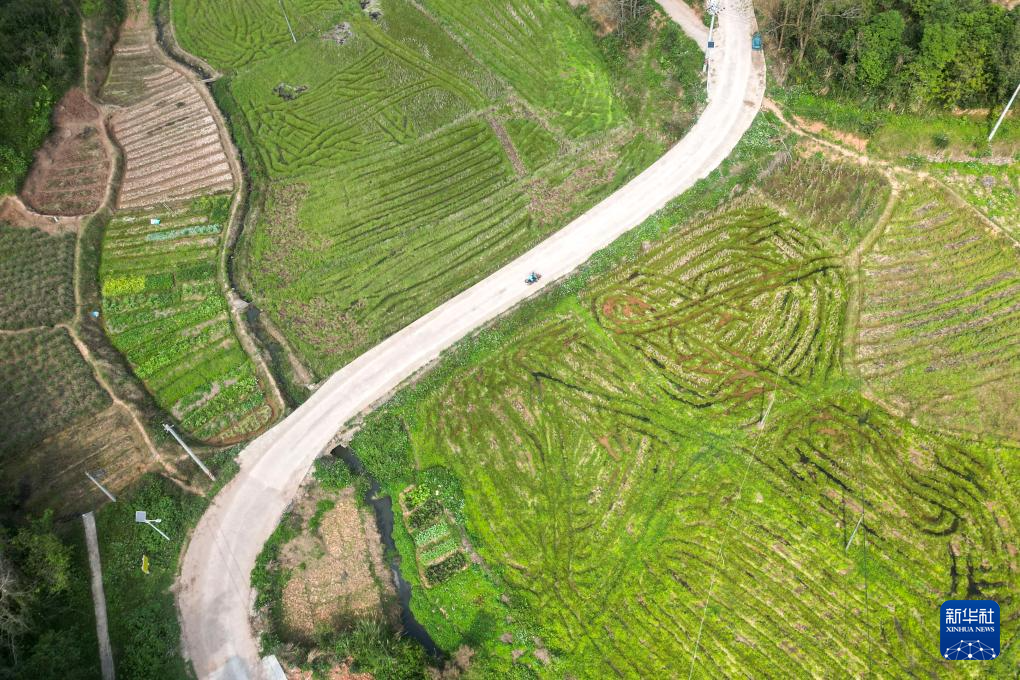 2月19日,在广西兴业县山心镇公和村,钟伟平骑行在出诊路上(无人机照片)。