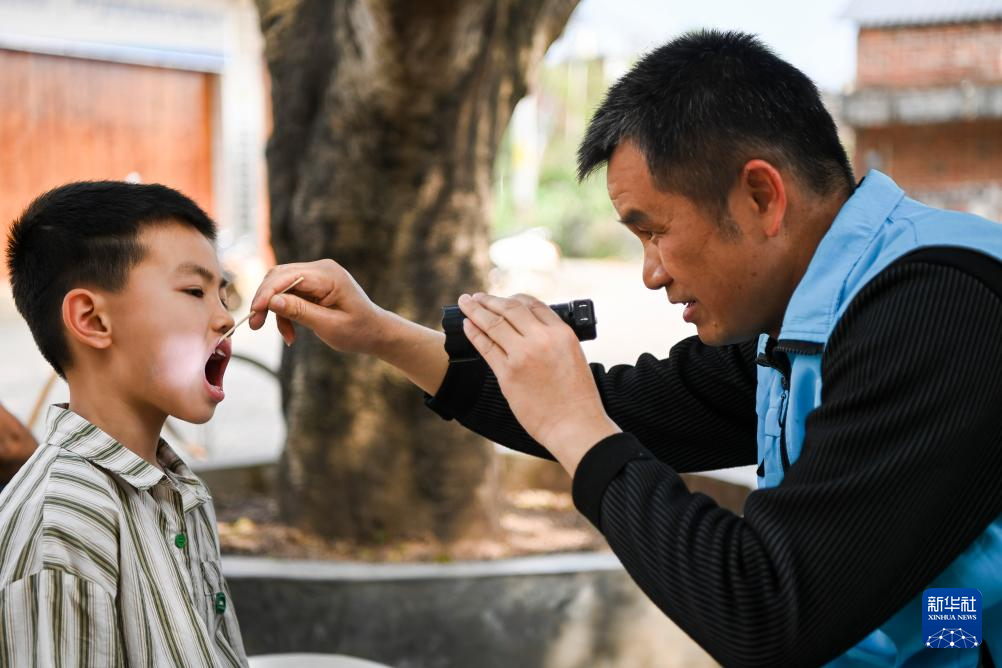 2月19日,在广西兴业县山心镇公和村,钟伟平(右)给小朋友检查口腔健康。
