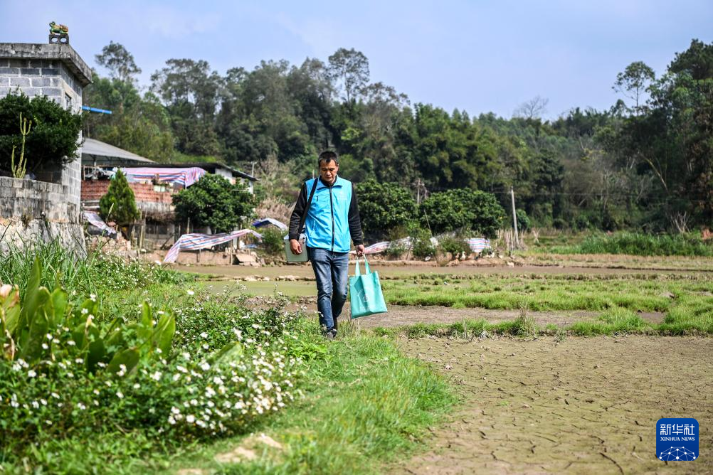 2月19日,在广西兴业县山心镇公和村,钟伟平行走在出诊路上。