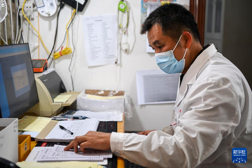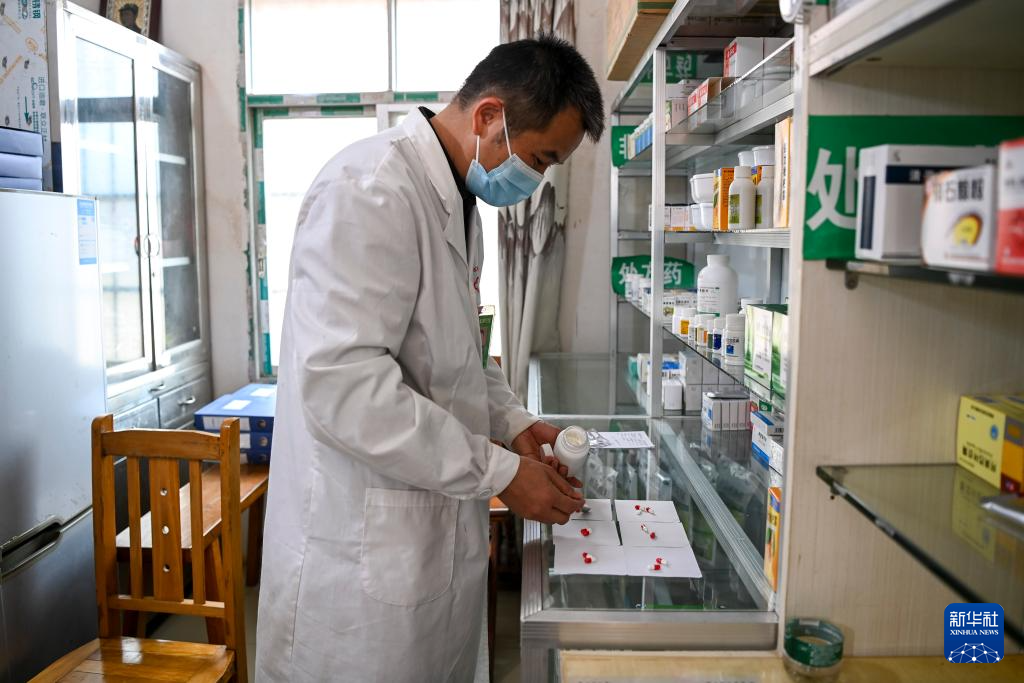 2月19日,钟伟平在广西兴业县山心镇公和村卫生室配药。