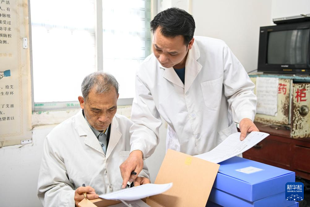 2月20日,在广西兴业县石南镇环江村卫生室,梁柱明(左)与儿子梁德和一起完善村民的健康档案。