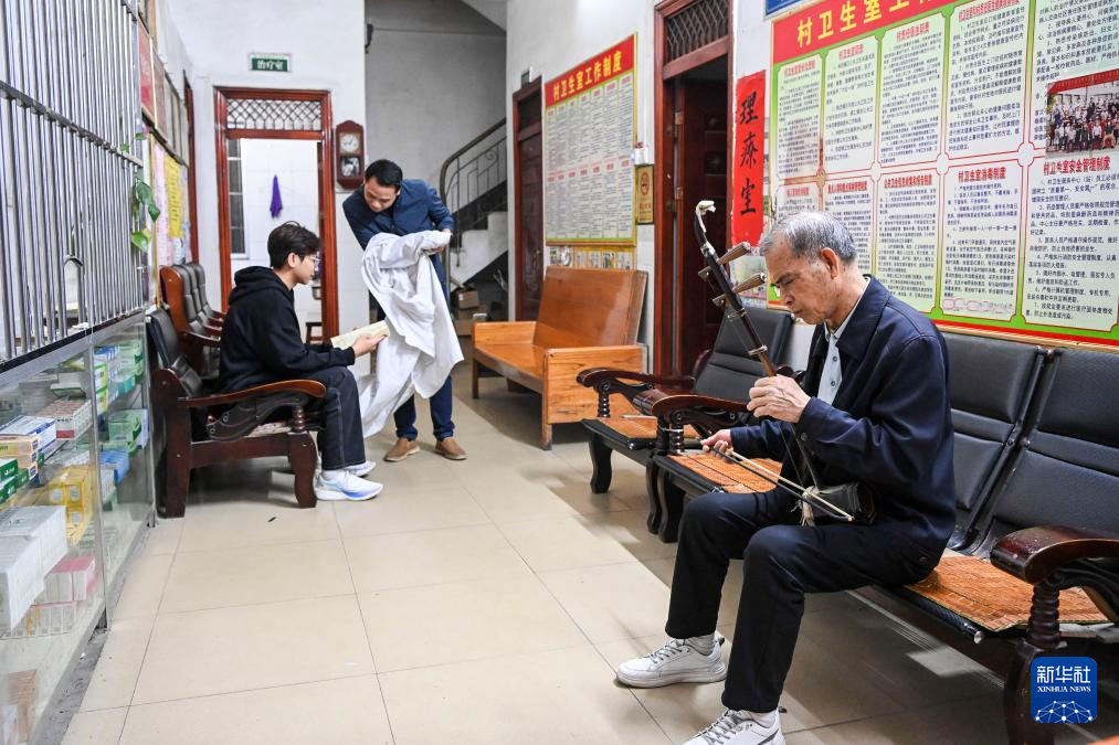 2月20日,在广西兴业县石南镇环江村卫生室,结束了一天的工作的梁柱明(右)拉起二胡,梁德和与儿子在一旁聊天。