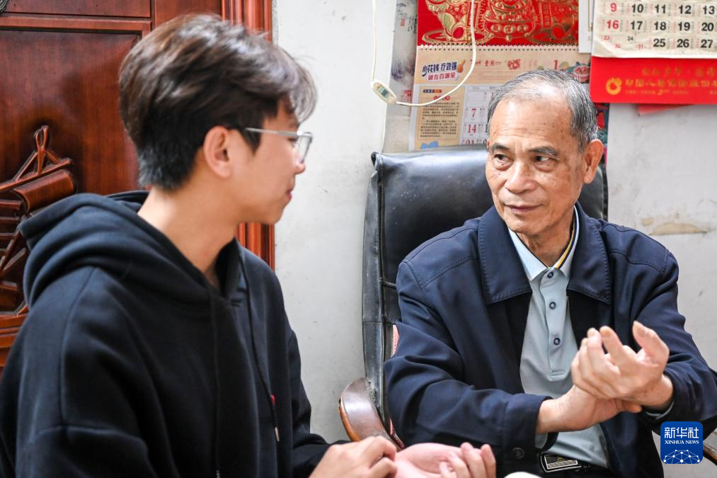 2月20日,在广西兴业县石南镇环江村卫生室,梁柱明(右)教孙子梁思为把脉。