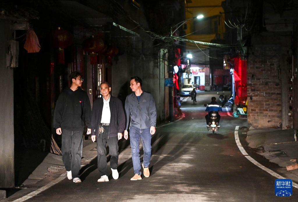 2月20日,在广西兴业县石南镇环江村,梁柱明(右一)和儿子梁德和(右三)与村民交流。