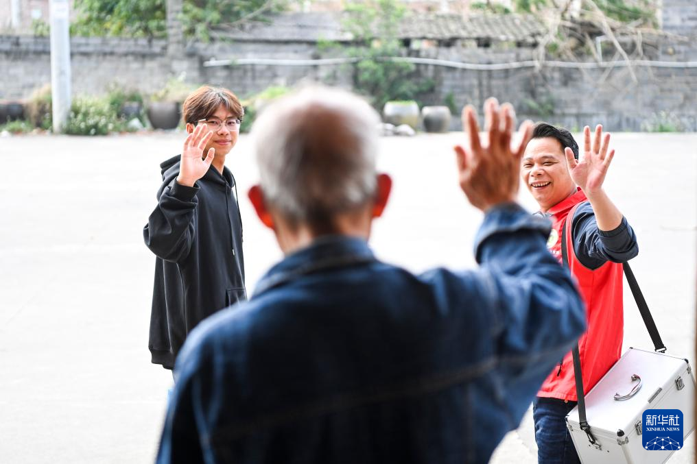 2月21日,在广西兴业县石南镇环江村,梁德和(中)带着儿子梁思为一起入户为老人测量血压。