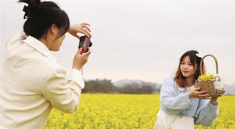 春节假期期间,柳城县太平镇黄宜村连片的油菜花盛开,黄灿灿的油菜花随风摇曳,一派生机勃勃的景象,游人沉醉其中,拍照留念,尽享春日田野的美好。