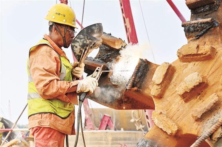 “回来即开工。”来自四川南充的蒋先生说,他返乡过年后于18日赶回工地,19日即投入工作。他是工地焊工,正在对冲孔打桩机的锤头进行焊接,只见他将一些铁块焊接在锤头底部,以增加锤头的冲击力。记者看到,由钢板搭建而成的栈桥上,堆放着一个个巨大的锤头、施工围堰用的大圆筒和多台打桩机。