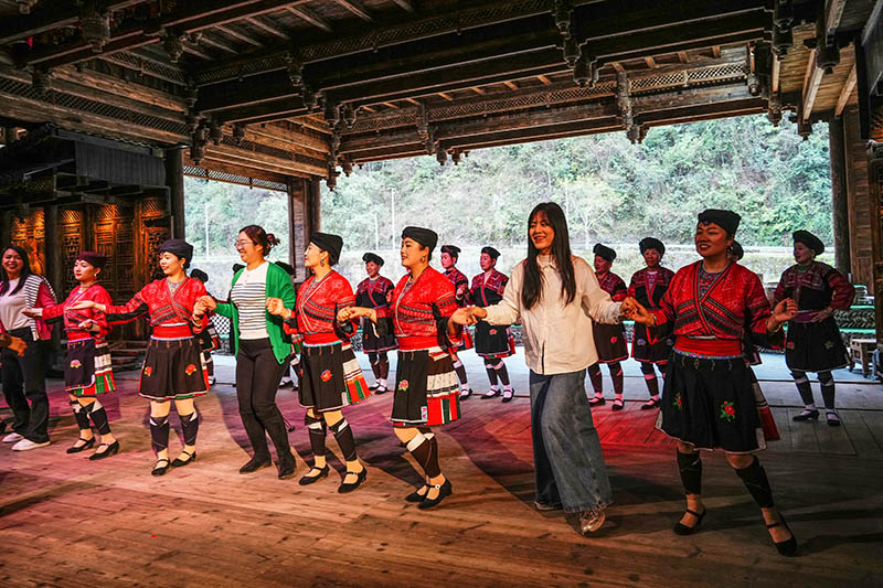 在龙胜江口村,研学团前往由侗族人民自发为牺牲红军建设的烈士陵园,缅怀革命先烈,并沿途参观红武亭、小粮仓遗址,聆听传奇故事。此外,江口村还打造了户外拓展、特色蜡染非遗手工,多耶舞等体验活动,游客还能收获当地特色美食、蔬果特产、刺绣工艺品等特色产品。