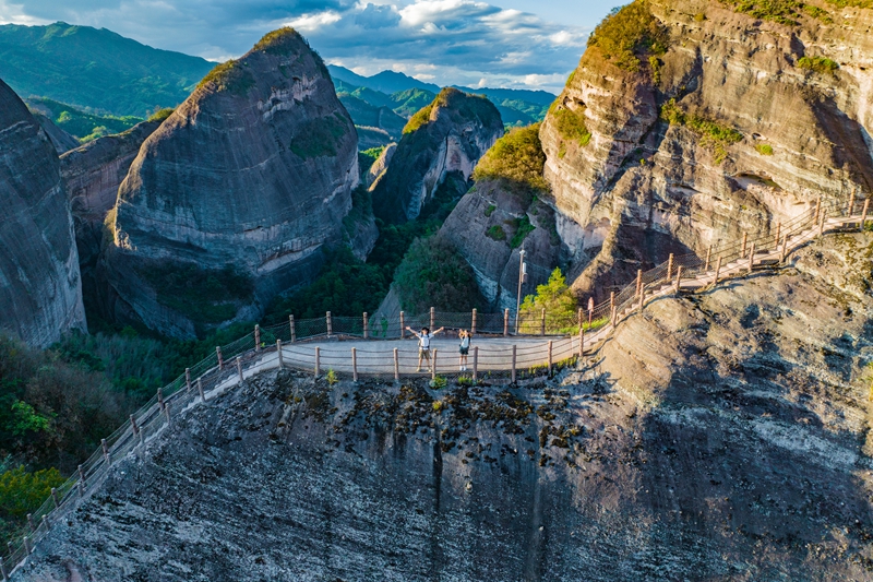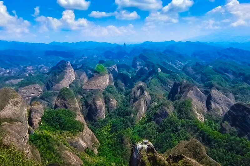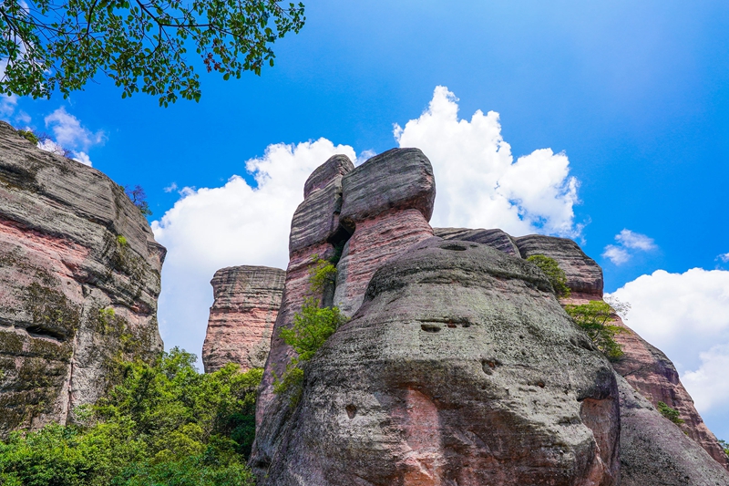 八角寨景观资源天赋异禀,地质地貌鬼斧神工,其中以群螺观天、龙脊天梯、凌渊谷、鲸鱼闹海等为绝胜,集黄山之奇、华山之险、桂林之秀于一身,是登山瞰丹霞风光的好去处。