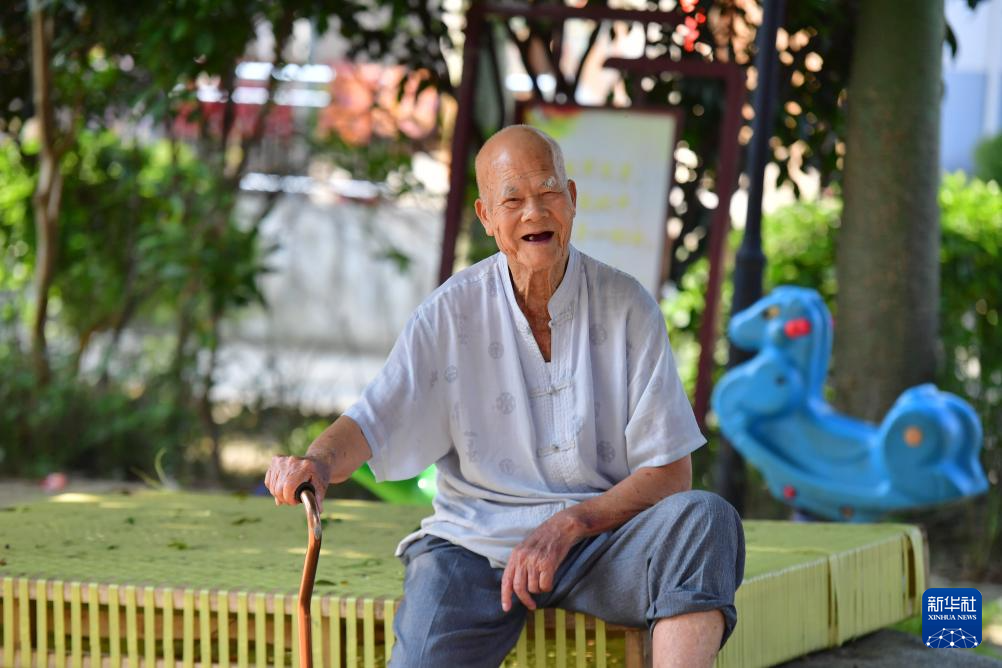 在柳州市柳江区三都镇觉山村,93岁的韦绍堂老人在小广场上休闲(5月23日摄)。