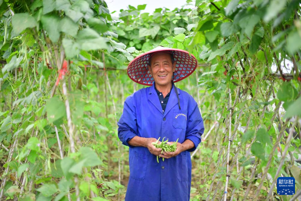 在柳州市柳江区三都镇觉山村,村民韦初良在摘豆角(5月15日摄)。