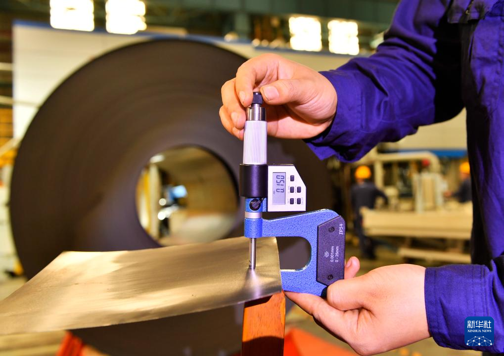 在广西柳州市柳钢集团冷轧厂,工作人员展示厚度为0.15毫米的冷轧带钢(5月10日摄)。