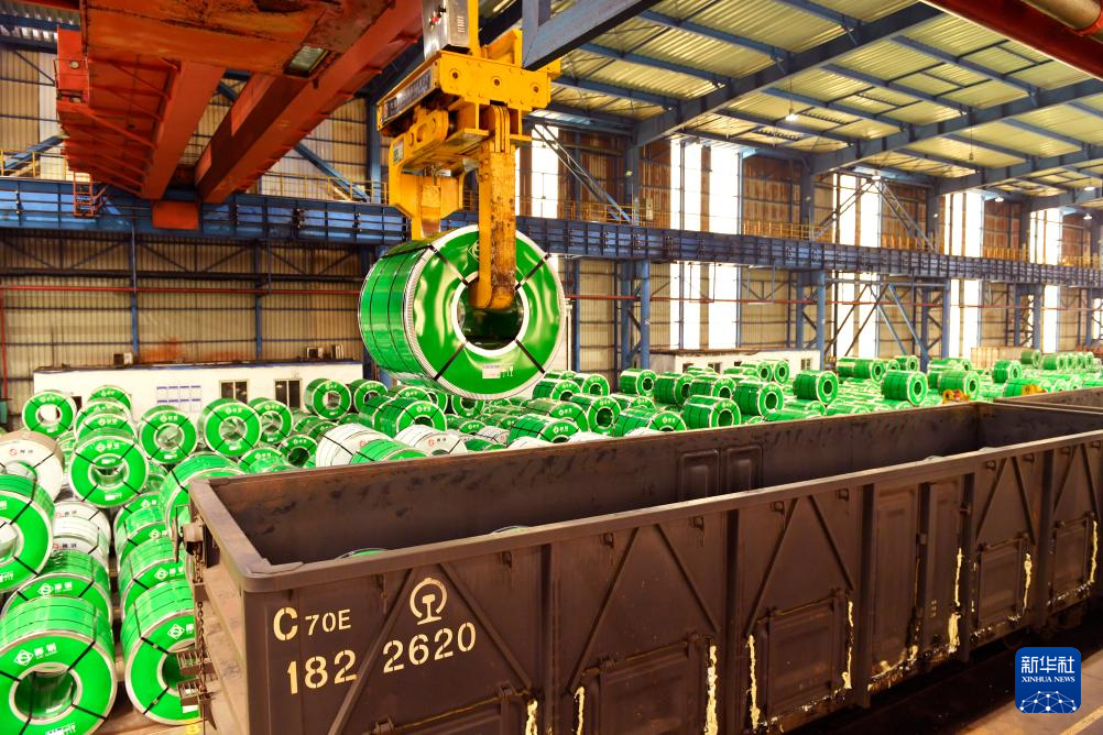 在广西柳州市柳钢集团冷轧成品库房,起重机吊运成品钢卷至火车上(5月10日摄)。