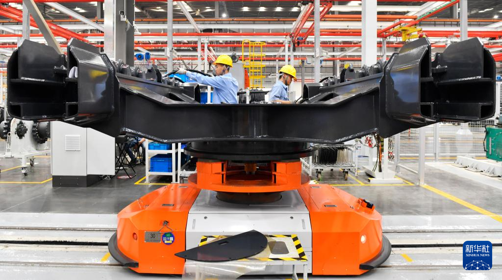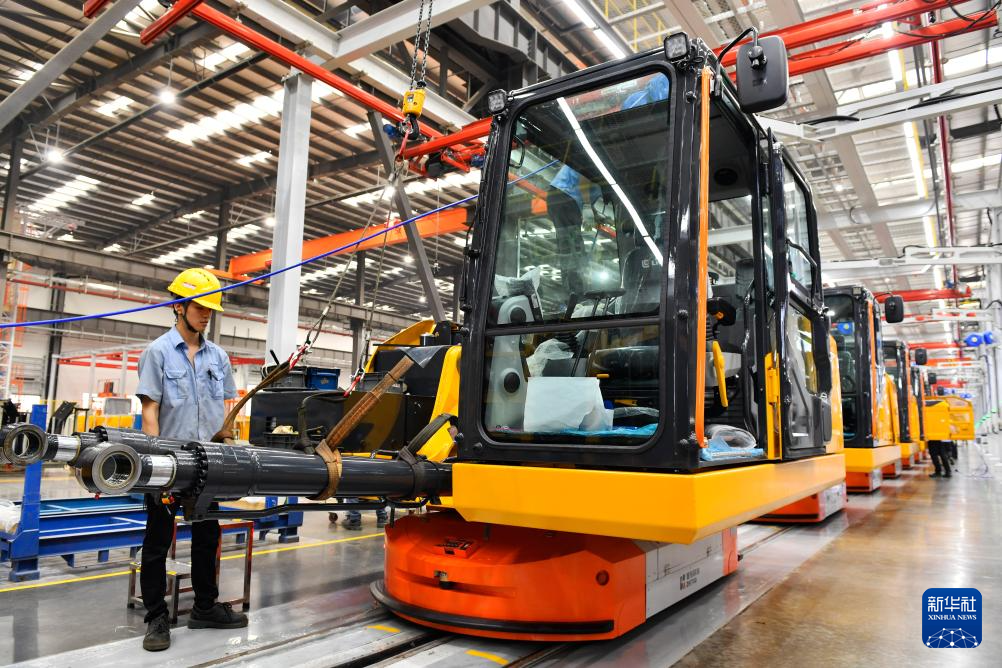 在广西柳州市柳工挖掘机智慧工厂,工作人员操作起重机将液压油缸吊运到挖掘机平台总成(5月10日摄)。