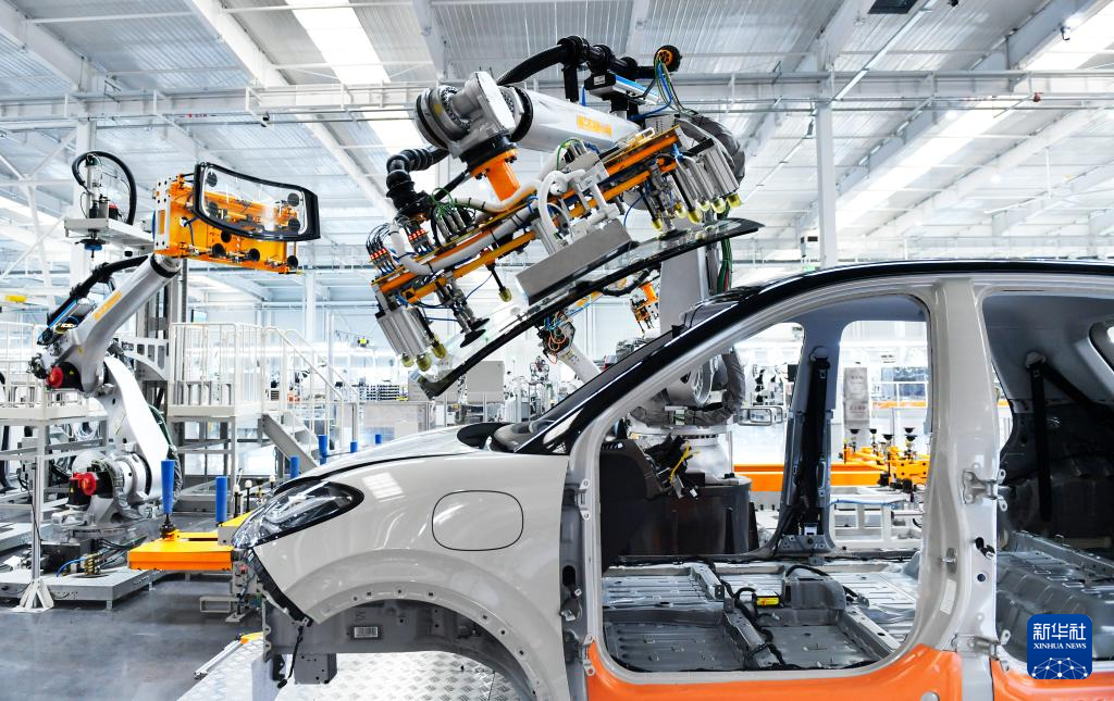 在广西柳州市上汽通用五菱精益智造工厂,机器人为汽车装配挡风玻璃(5月9日摄)。