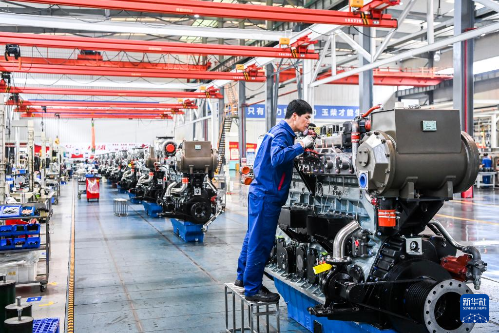 这是在广西玉林市玉柴机器集团有限公司拍摄的船用发动机生产线(5月15日摄)。