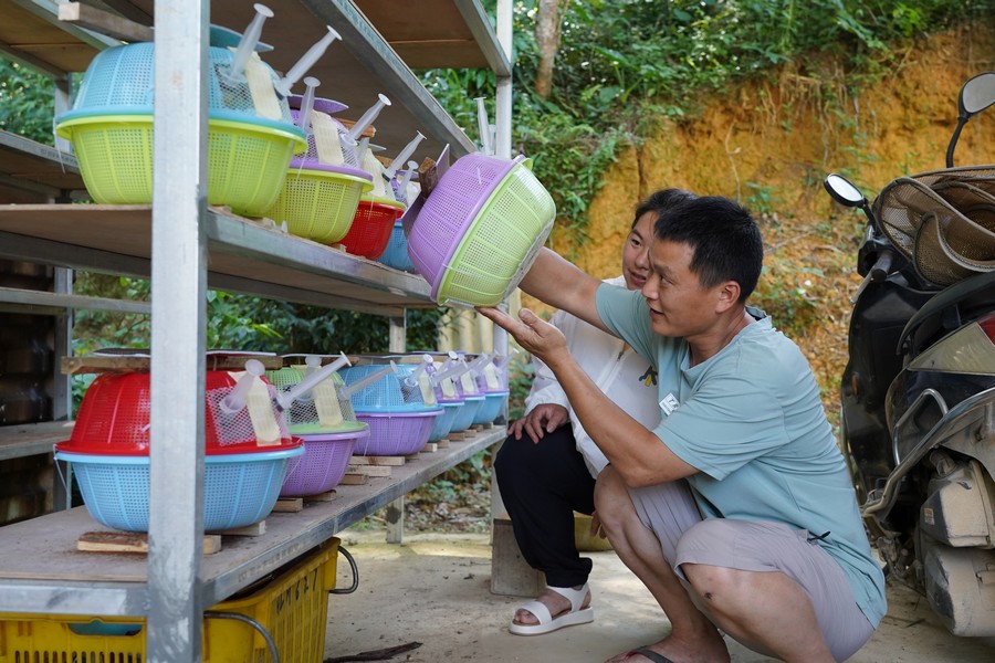 村民薛帆夫妇正在查看胡蜂繁育情况 莫斌摄