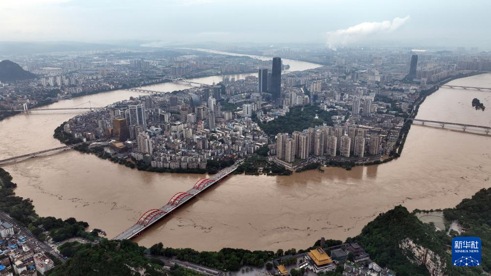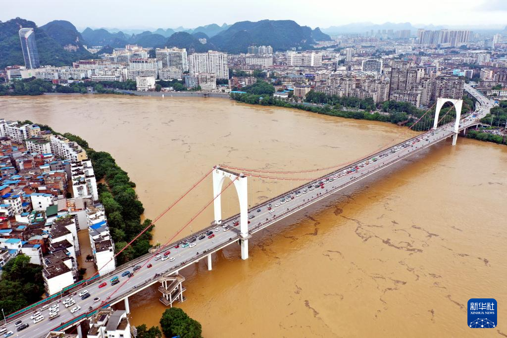 这是洪水经过的柳江柳州市区段(6月18日摄,无人机照片)。