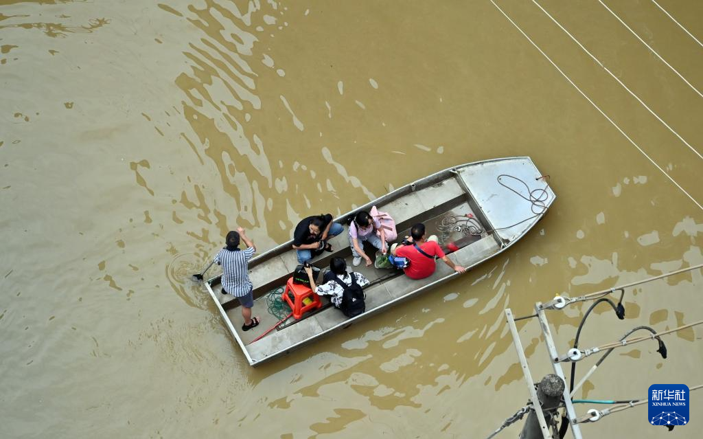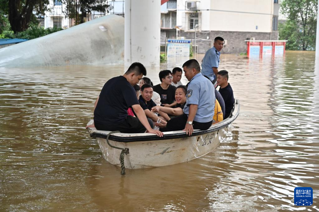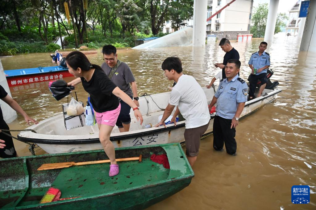 6月18日,在广西柳州市滨江西路,民警用冲锋舟接送居民。