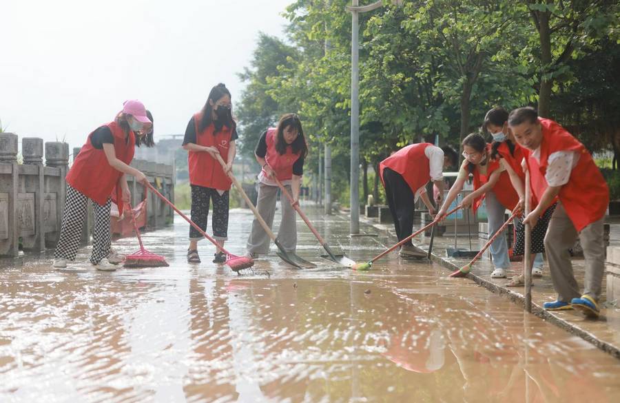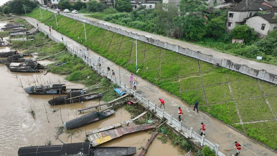 受近期强降雨影响,广西柳州市柳城县融江河段沿江道路出现不少淤泥。随着水位的下降,6月19日,柳城县组织600多名党员干部,在沿江道路开展清理淤泥行动,为群众出行提供保障。(汤晓逵 骆毅 罗馨湘)
