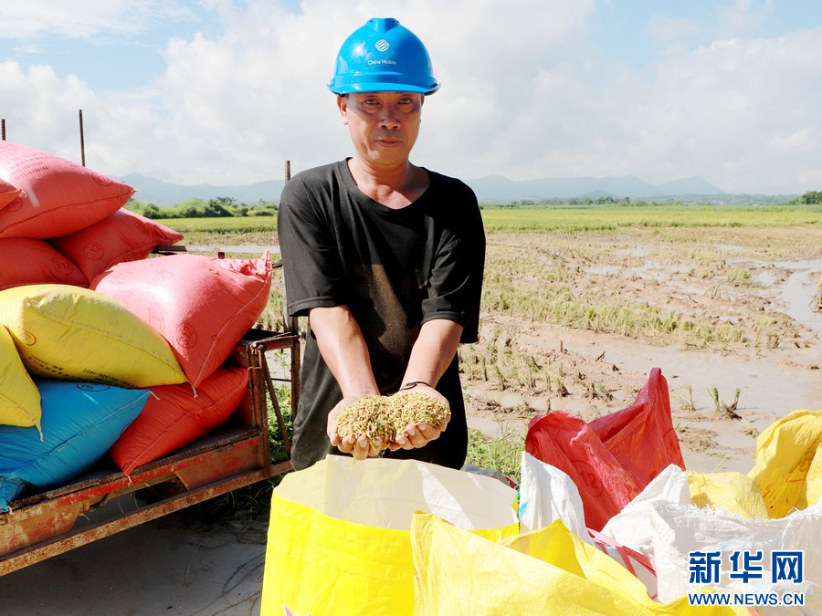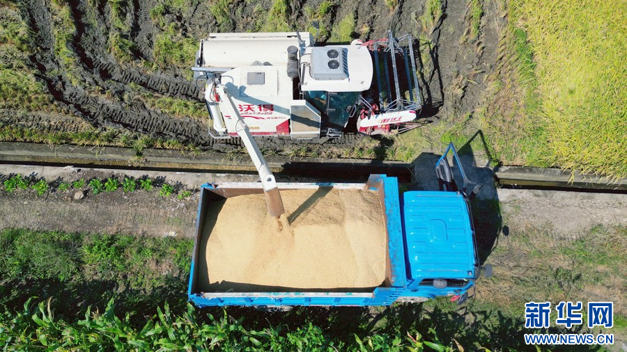 广西崇左市宁明县明江镇岑岳村群众正在装运收割机收割完从谷仓里卸出的稻谷。周贻刚 摄