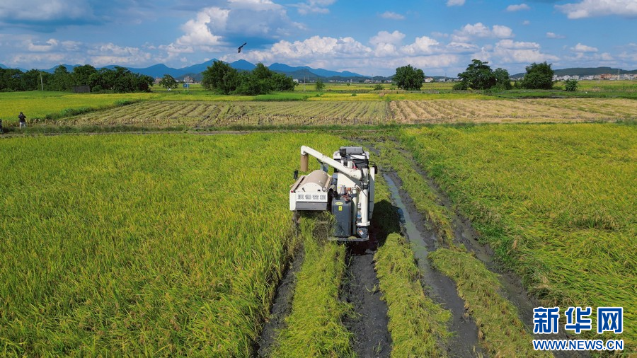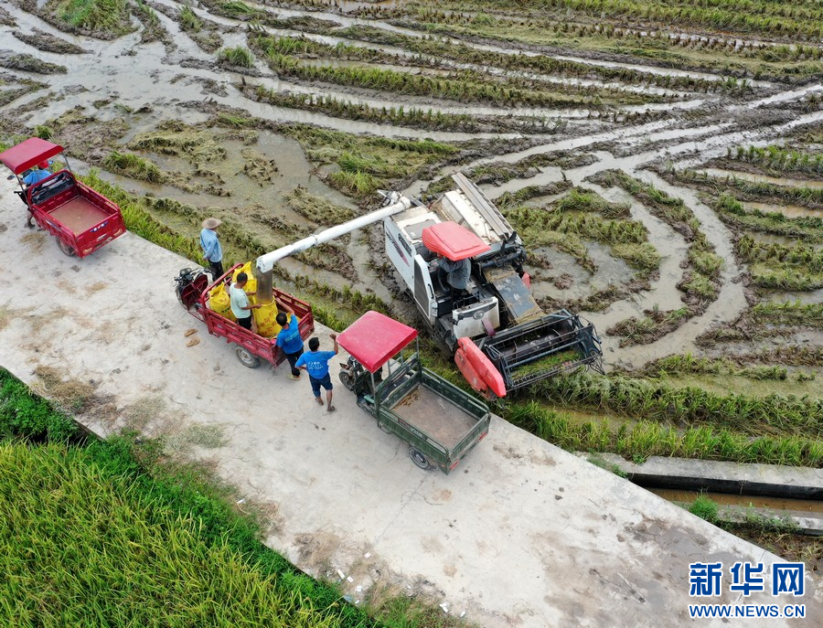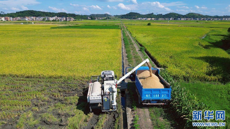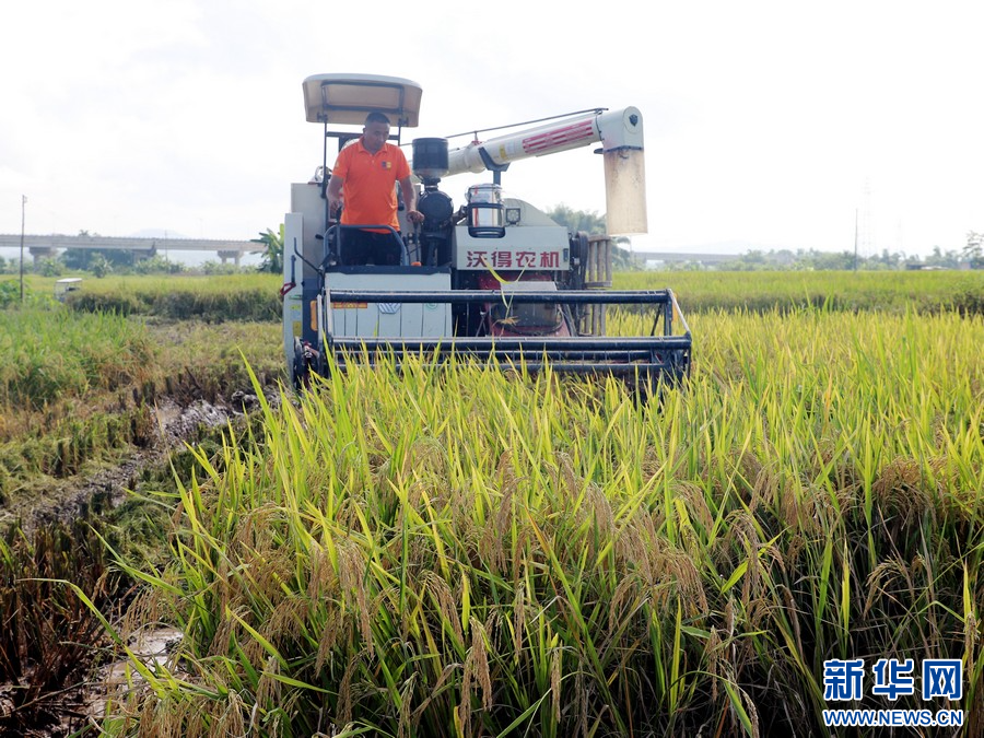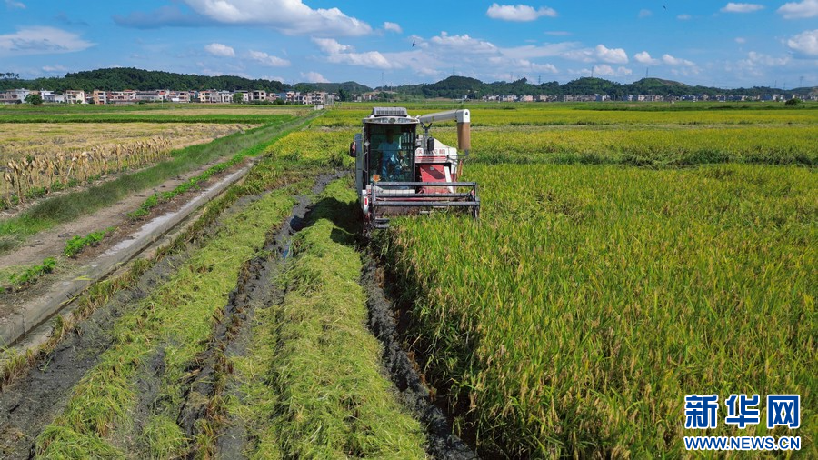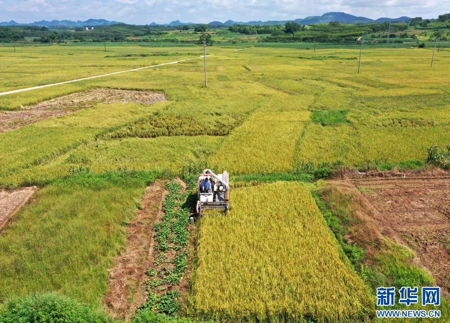 广西桂平市厚禄乡延寿村机械化夏收早稻。覃昌业 摄