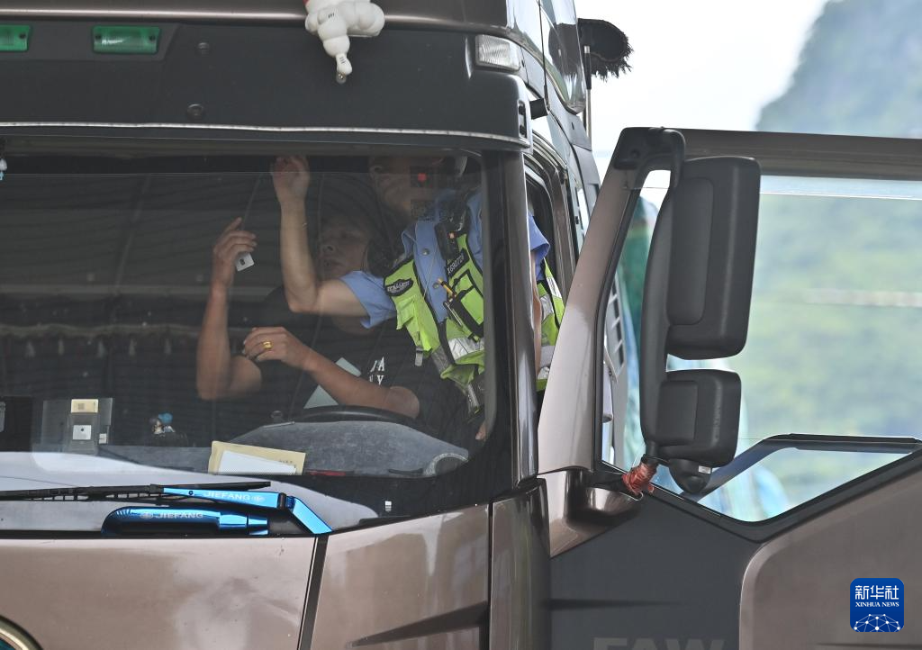 7月23日,在广西柳州市柳江区里高镇,警务人员在检查货车司机是否存在疲劳驾驶行为。