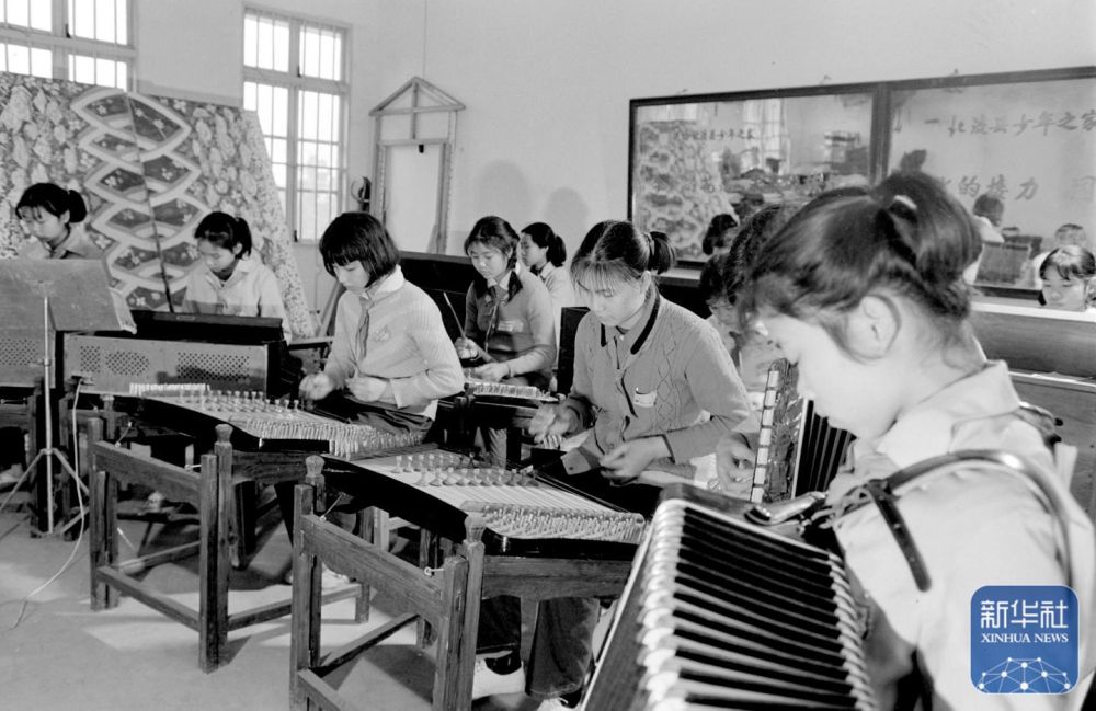↑广西壮族自治区北流县少年之家是全县少年儿童的活动中心,孩子们利用课余时间和节假日到此学习文化和科学知识,参加各种有益于身心的活动。北流县少年之家创建于1956年,建筑面积1900平方米。现有科技馆、歌舞厅、阅览室等室内活动场所和一个露天溜冰场,可同时容纳近千名少儿活动。图为北流县少年之家的小乐队在练习。新华社记者李广佑 摄(1984年7月28日发)