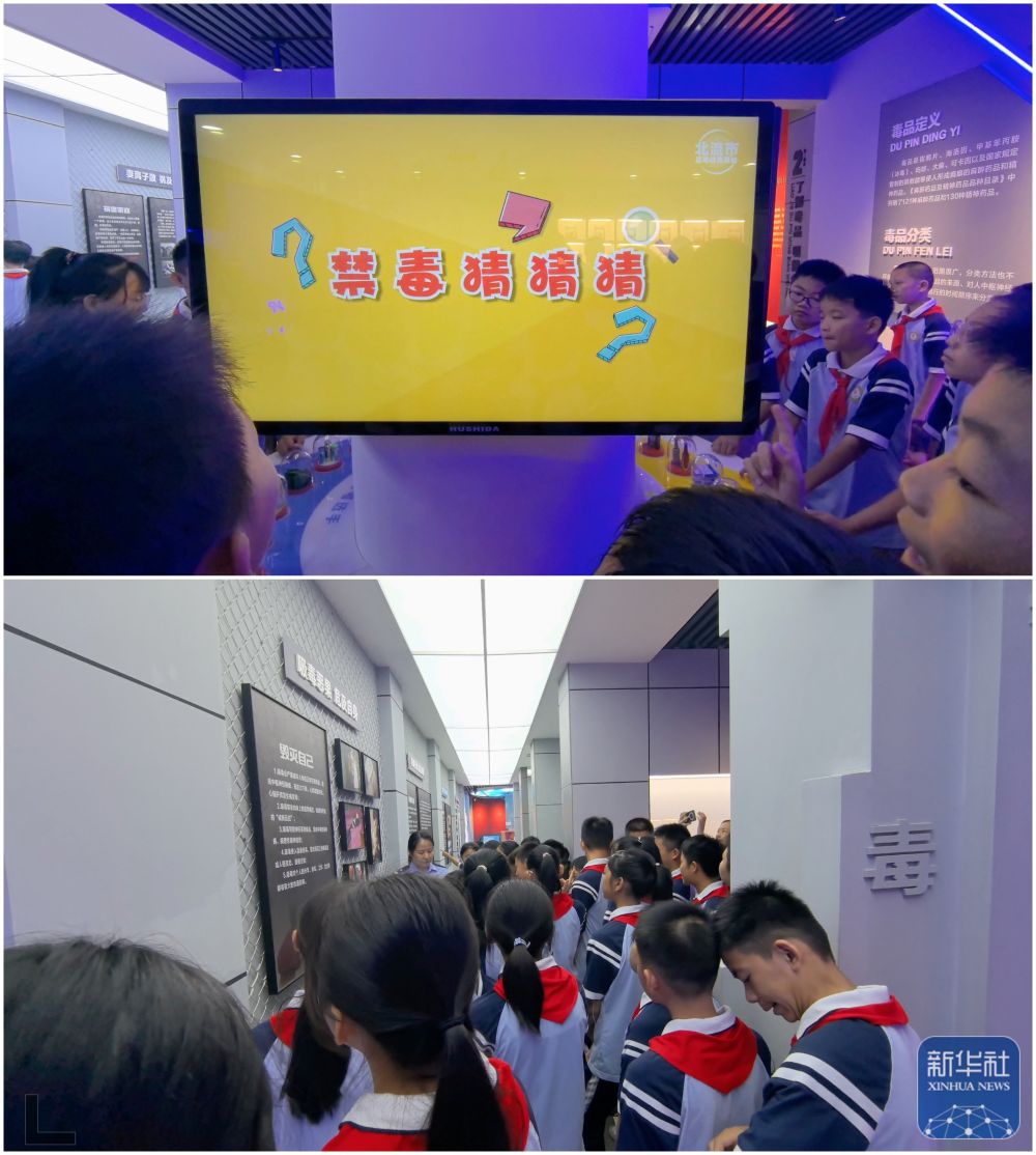 ↑拼版照片:2024年7月12日,广西北流市新松小学的40多名学生,来到北流市禁毒教育基地,通过基地的多个沉浸式互动体验项目,上了一堂生动的禁毒宣传课。上图为学生体验沉浸式互动项目——“禁毒猜猜猜”;下图为学生在参观北流市禁毒教育基地。新华社记者梁舜 摄