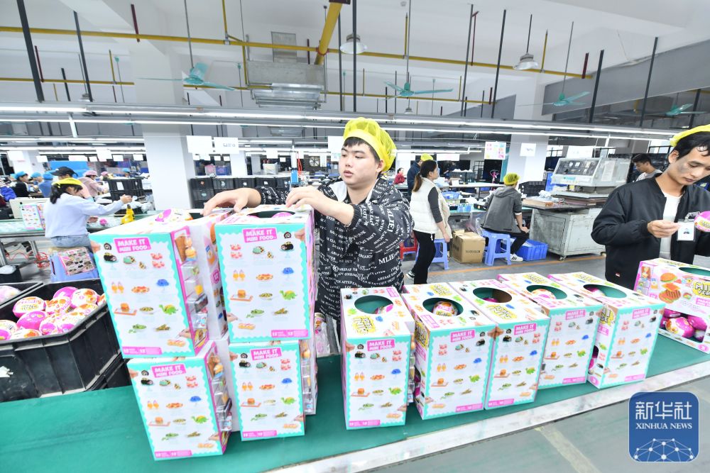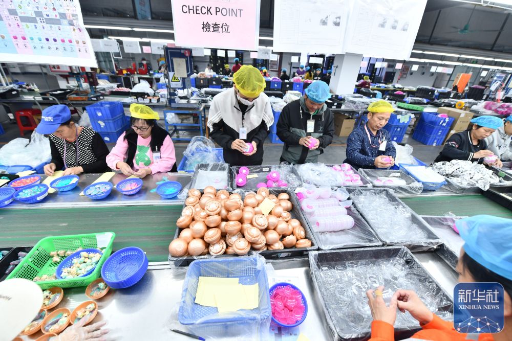 ↑2023年11月30日,在广西北流市“玉商回归产业园”一家玩具生产企业,工人在生产线上作业。新华社记者黄孝邦 摄