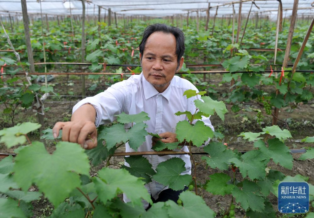 ↑2013年4月9日,在广西北流市白马镇,广西北流市鹏程家庭农场的场主王荣华在为葡萄打杈。广西壮族自治区首个经工商部门登记注册成立的家庭农场——北流市鹏程家庭农场已初具规模。新华社记者 周华 摄