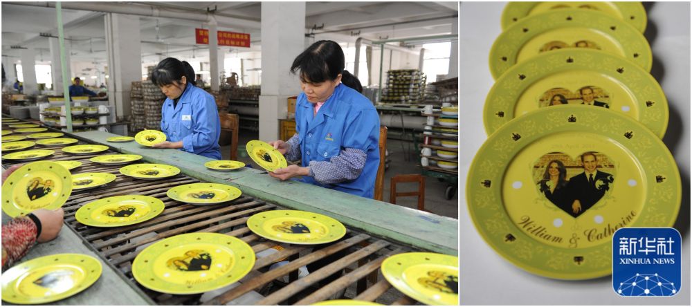 ↑拼版照片:2011年1月10日,广西北流三环企业集团员工生产英国威廉王子婚礼用瓷。广西北流市三环集团经过层层筛选,获得英国王室婚礼用瓷订单。此次定制的瓷器一共有5个品种共计16008件,主要用于英国威廉王子的婚礼用瓷以及婚礼的礼品用瓷。新华社发 蒋寿荣 摄