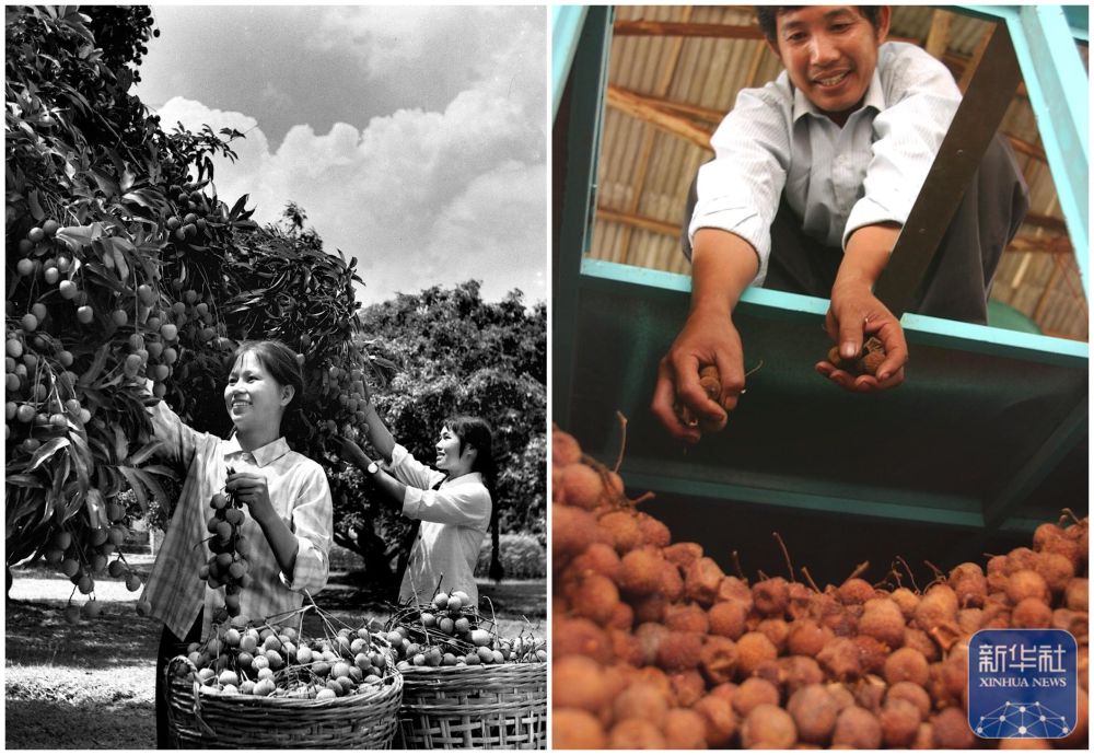 ↑拼版照片:左图为1977年7月14日,广西壮族自治区北流县荔枝场的工人在收摘荔枝(新华社稿);右图为2005年7月3日,在广西北流市北流镇甘村,农技师在检验准备出炉的荔枝干。新华社记者翟希 摄