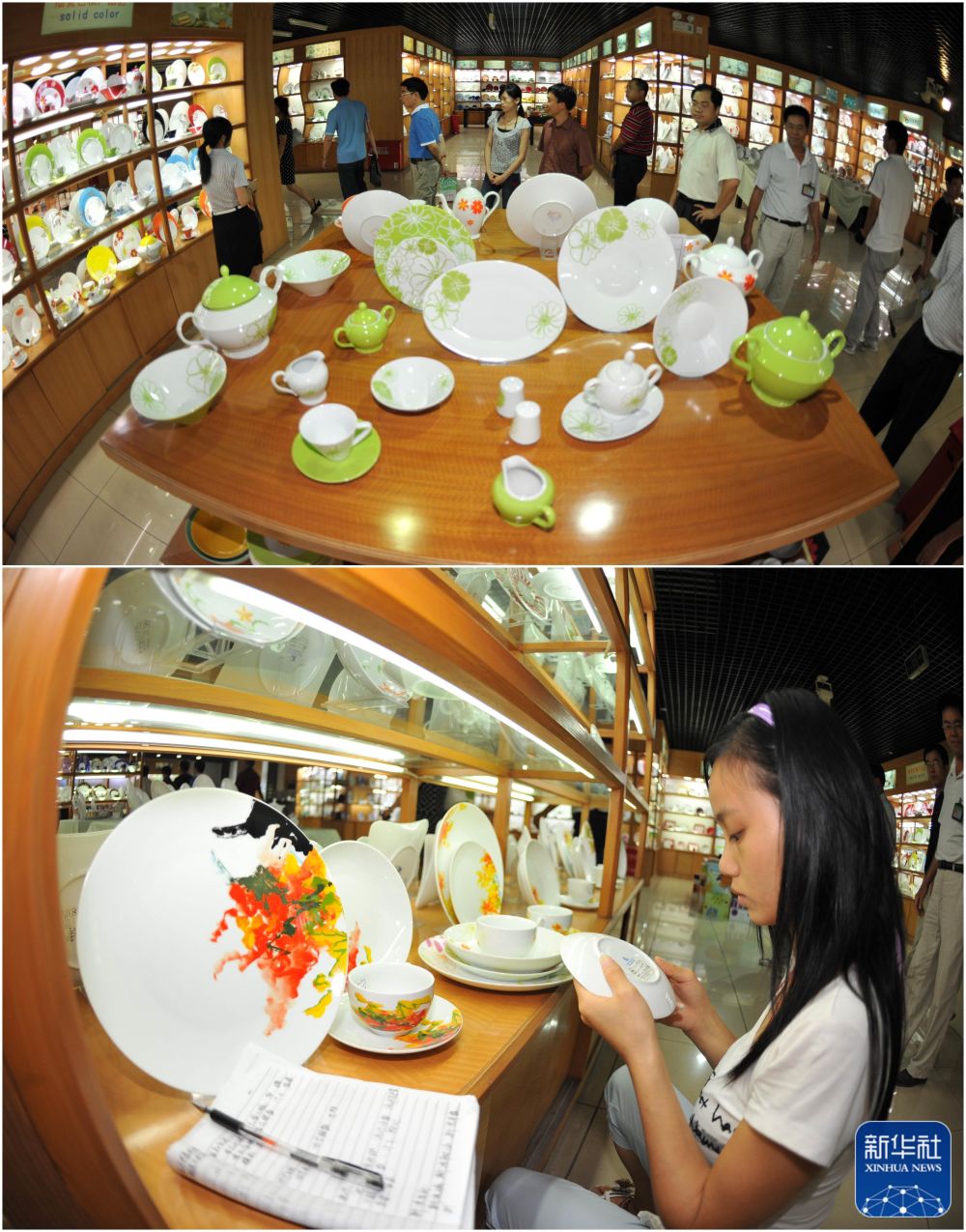 ↑拼版照片:2009年8月20日,客商在广西三环企业集团股份有限公司内参观日用陶瓷产品。受国际金融危机影响,主要依赖国际市场的广西北流日用陶瓷产业遭受沉重打击。2009年初以来,在当地政府和广西相关部门的帮助下,北流陶瓷企业重振信心,调整经营战略,逐步走出困境。新华社记者周华 摄