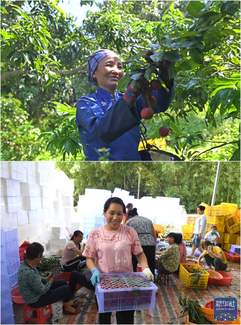 ↑拼版照片:上图为2023年6月27日,广西北流市北流镇六行村村民在采摘荔枝。下图为2023年6月27日,广西北流市北流镇六行村村民在搬运荔枝。新华社记者 周华 摄