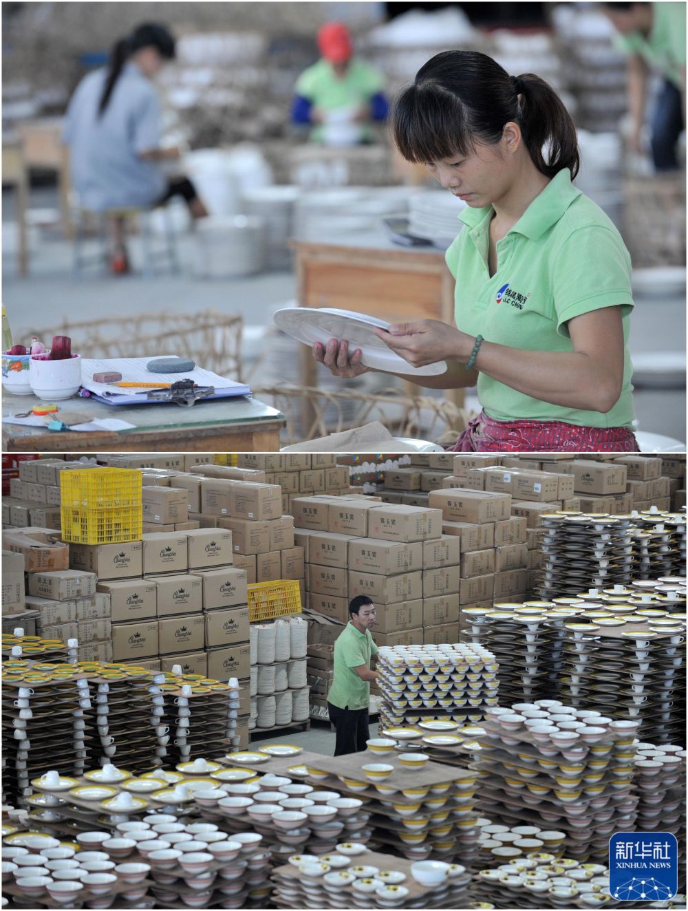 ↑拼版照片:上图为2013年7月24日,在广西北流市锦昌瓷业有限公司,工人在逐个检查高档日用陶瓷产品;下图为2013年7月24日,在广西北流市锦昌瓷业有限公司,工人在搬运日用陶瓷。为应对日益严峻的市场竞争形势,广西北流市不断提升产品质量和档次,拓展高档日用餐具、茶具和咖啡用具市场,取得显著成效。据广西北流市有关负责人介绍,北流市生产的高档日用陶瓷销量逆势增长,部分高档日用陶瓷产品在市场上甚至出现供不应求的局面。新华社记者周华 摄
