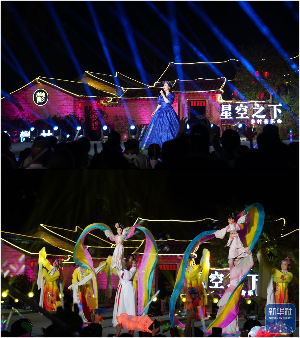 ↑拼版照片:2024年2月21日晚,在广西北流市河村村史馆门前广场举办的“星空之下”乡村音乐会,奏响“春之声”,唱响乡村振兴主旋律,以艺术赋能美丽乡村建设,为乡村发展注入新活力。新华社发