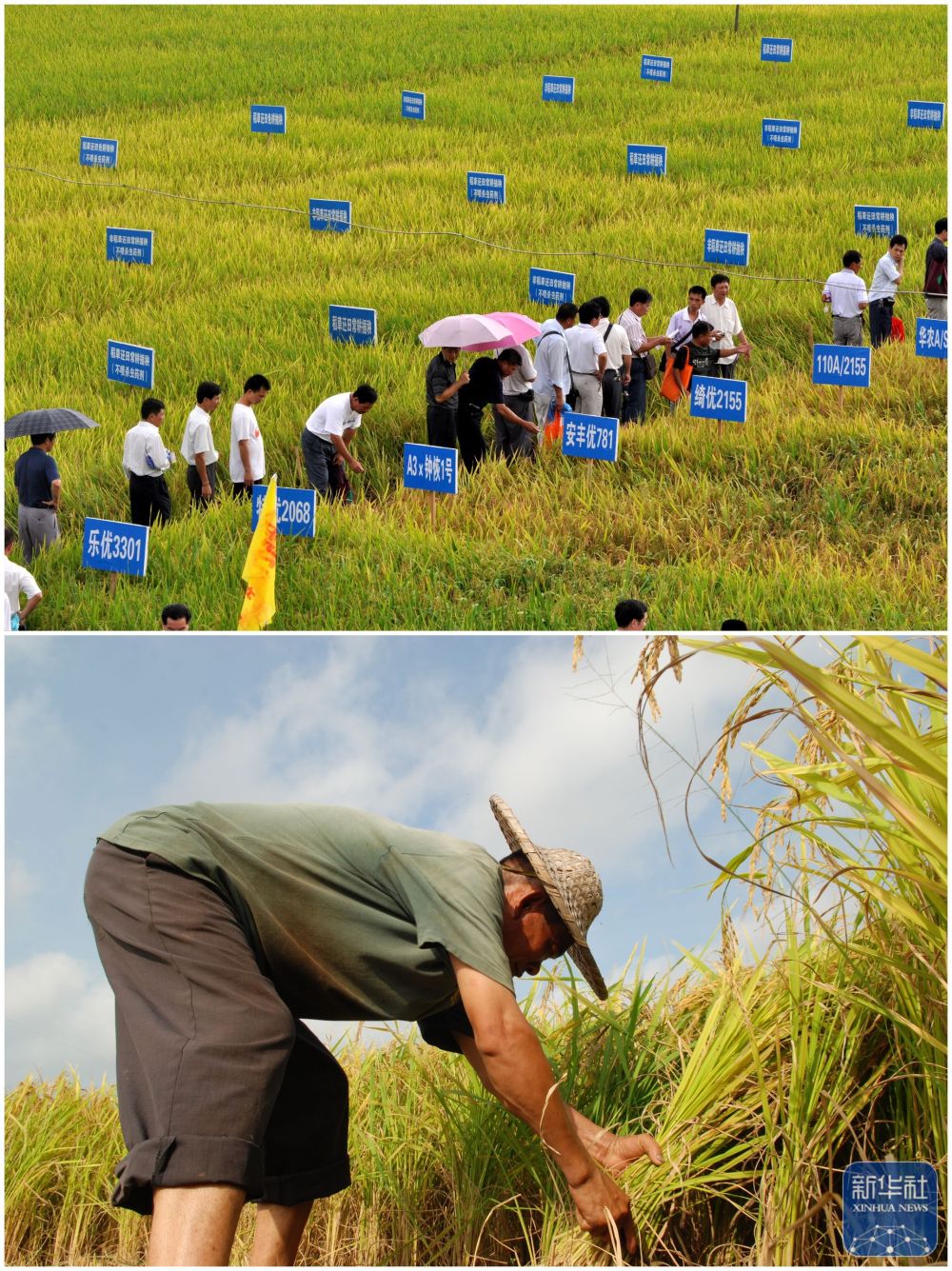 ↑拼版照片:上图为2010年7月13日,在广西北流市新圩镇河村,农技人员在田间“看禾选种”。下图为2010年7月13日,广西北流市新圩镇河村农民在稻田里收割早稻。新华社发(喻湘泉 摄)