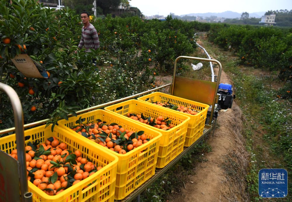 ↑2019年12月24日,在广西北流市塘岸镇利民村,村民利用自动轨道车运送刚刚采摘的沙糖橘。利民村曾是一个贫困村,近几年该村大力发展沙糖橘种植,助力全村成功脱贫。2019年,利民村沙糖橘种植面积已超过1000亩,预计总产量480万斤。新华社记者周华 摄