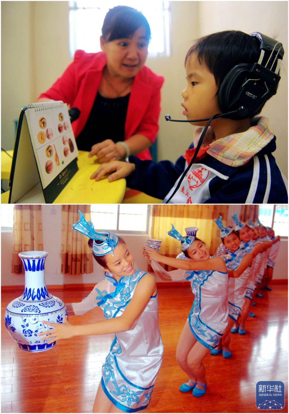 ↑拼版照片:上图为2012年10月30日,5岁的听力残疾儿童林思远在单训室进行一对一单训听力。下图为2012年10月30日,北流市特教学校的高年级学生在排练节目。新华社记者张爱林 摄