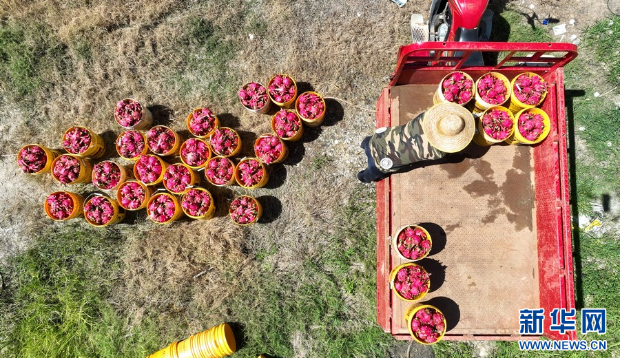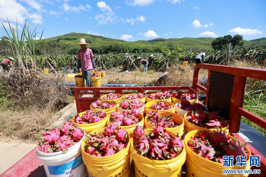 工人搬运采摘好的火龙果。