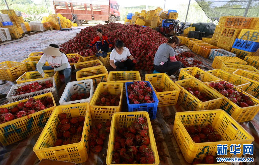 工人将采摘好的火龙果挑出农场。