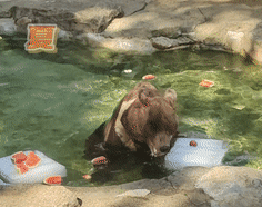 近日高温天气来袭。广西南宁动物园饲养员为动物们准备了冰镇西瓜等食物,还在休息区域放置冰块,帮助它们防暑降温。泡冰浴的棕熊、一口吃掉半个西瓜的河马……请欣赏!夏日限定动物降暑“表情包”。