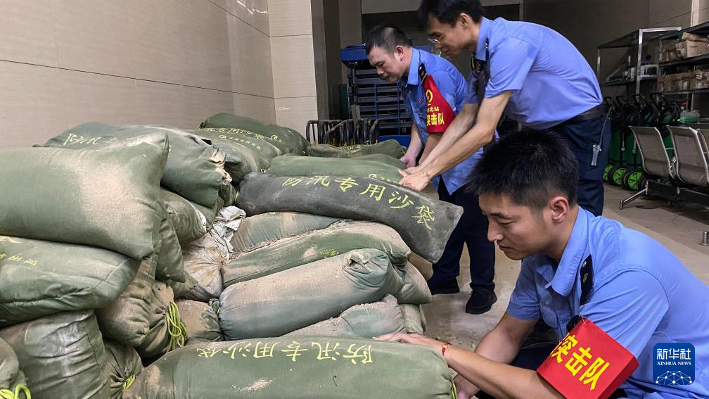 在防城港北站,青年突击队员们提前备足沙袋、潜污泵、抽水带等防台防汛应急物资(9月5日摄)。